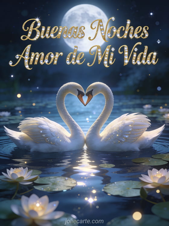 Envía un majestuoso deseo de buenas noches al amor de tu vida con esta hermosa tarjeta gratis. Una elegante pareja de cisnes formando un corazón en un lago iluminado por la luna con nenúfares, para una verdadera buenas noches romántica. Descubre también una tarjeta buenas noches mi amor mensaje o una tarjeta buenas noches te quiero mi amor.