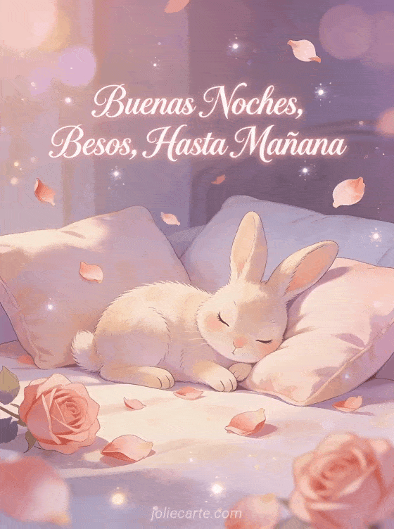Desea a alguien unas romƔnticas buenas noches con esta tierna tarjeta con un dulce conejito durmiendo entre suaves almohadas con delicados pƩtalos de rosa flotando. Descubre tambiƩn una tarjeta gif buenas noches besos hasta maƱana, una tarjeta humor buenas noches hasta maƱana o una tarjeta gif buenas noches hasta maƱana.