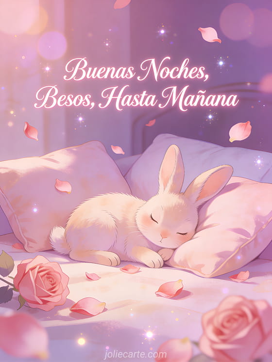 Buenas noches besos hasta maƱana un tierno saludo de buenas noches con un conejito dormido y pƩtalos de rosa
