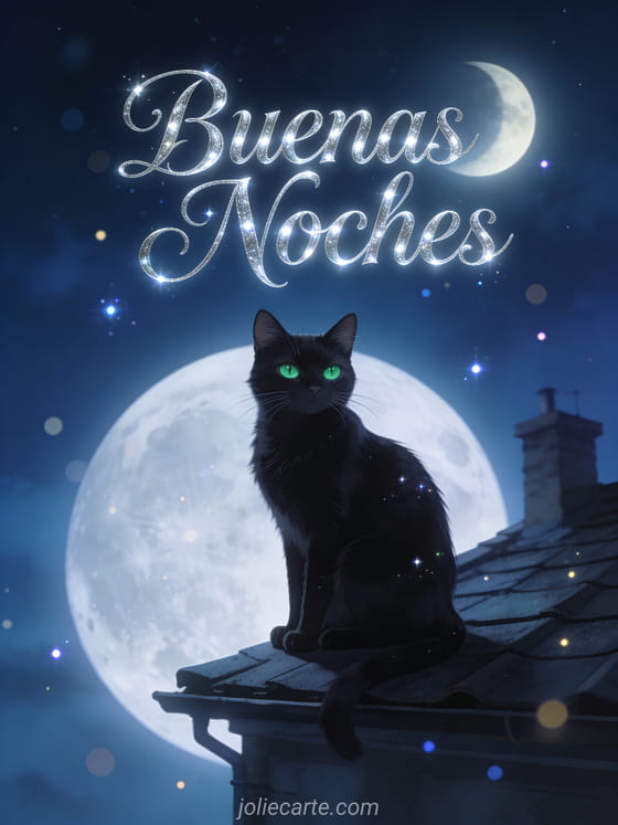 Envía esta misteriosa tarjeta de buenas noches con un elegante gato negro. Descubre también una tarjeta buenas noches gallo o una tarjeta buenas noches enamorados.