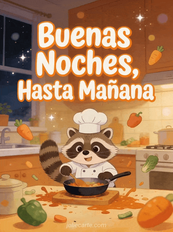 Haz sonreír a alguien con esta divertida tarjeta de buenas noches con mapache cocinero. Descubre también una buenas noches hasta mañana imagen o una buenas noches hasta mañana besos gif o una buenas noches hasta mañana tarjeta.