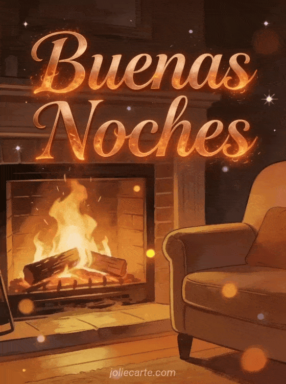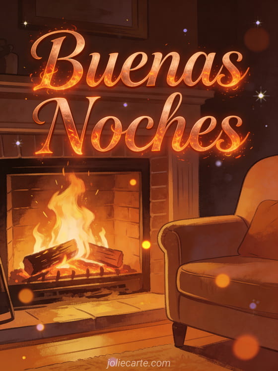 Envía un cálido buenas noches junto a la chimenea con esta acogedora tarjeta gratis. Una chimenea chisporroteante con llamas danzantes y un sillón acogedor, para un saludo de buenas noches íntimo y cálido. Descubre también una tarjeta buenas noches gif imagen o una tarjeta buenas noches gato negro.