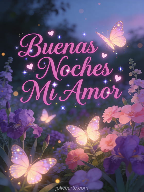 Envía un mágico mensaje de buenas noches a tu amor con esta hermosa tarjeta gratis. Un hermoso jardín de mariposas al atardecer con flores moradas y rosas y mariposas brillantes, para una buenas noches romántica de cuento de hadas. Descubre también una tarjeta desear buenas noches a tu amor o una tarjeta buenas noches mensaje amor imagen.