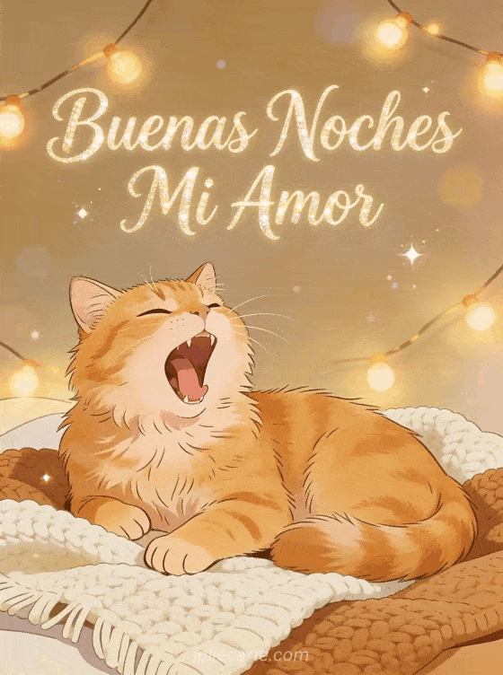 Envía un tierno mensaje de buenas noches mi amor con esta acogedora tarjeta gratis. Un adorable gato naranja bostezando en una manta tejida con luces, perfecta para un cálido mensaje de buenas noches. Descubre también una tarjeta buenas noches te quiero mi amor o una tarjeta buenas noches único amor.