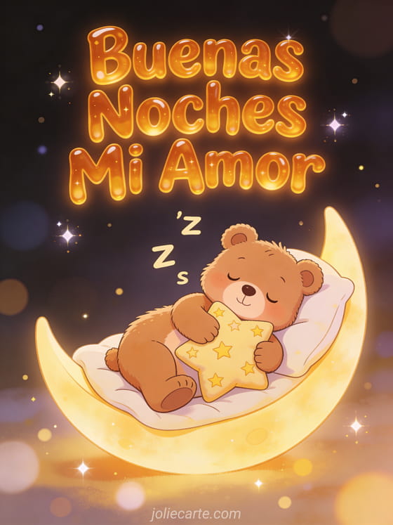 Envía un tierno mensaje de buenas noches mi amor querido con esta adorable tarjeta gratis. Un lindo osito abrazando una almohada en forma de estrella en una cama de luna creciente, para una buenas noches tierna y cálida. Descubre también una tarjeta buenas noches amor de mi vida o una tarjeta buenas noches mi amor mensaje.