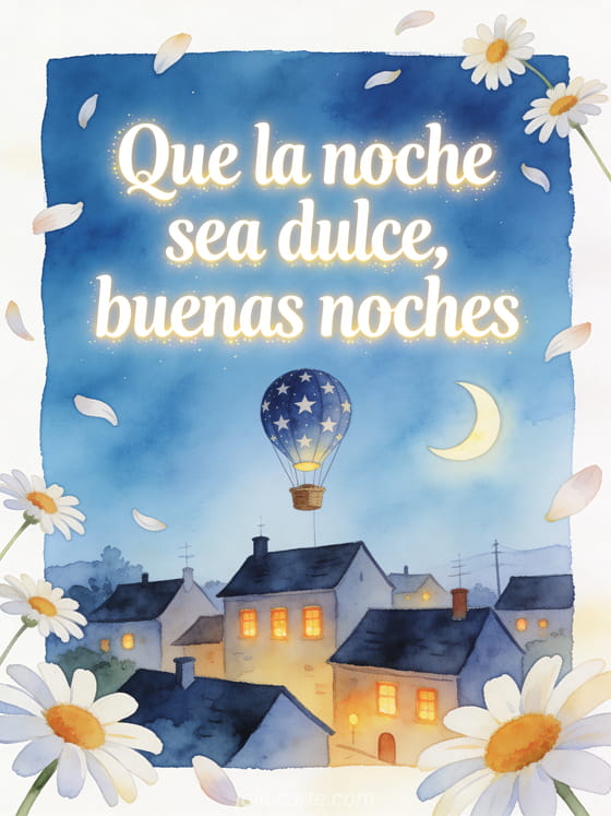 Envía un saludo suave de buenas noches con un pequeño globo aerostático con estrellas sobre un pueblo dormido, una luna creciente y pétalos de margarita flotando. Descubre también un mensaje lindo de buenas noches, buena noche y buenas noches tarjetas o deseos de buenas noches.