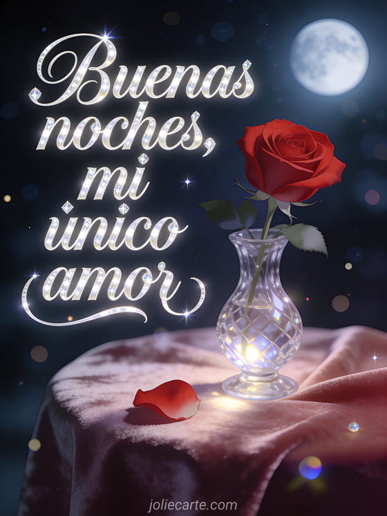 Envía un hermoso deseo de buenas noches a tu único amor con esta elegante tarjeta gratis. Una rosa roja perfecta en un jarrón de cristal bañada por la suave luz lunar, para una buenas noches romántica y exclusiva. Descubre también una tarjeta romántico buenas noches mi amor o una tarjeta te amo buenas noches mi amor.