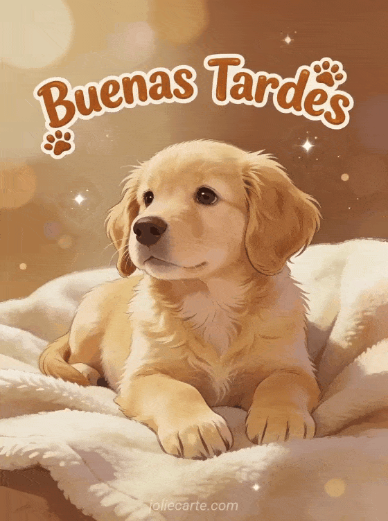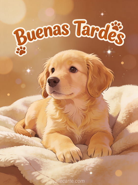 Calienta la tarde de alguien con esta adorable tarjeta con un lindo cachorro dorado de orejas caídas acurrucado en una suave manta. Descubre también una tarjeta buenas tardes flores, una tarjeta buenas tardes y noches besos o una tarjeta buenas noches gif brillante animado.