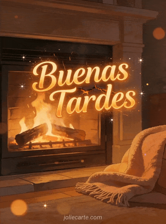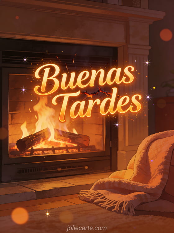 Desea unas buenas tardes con esta acogedora tarjeta que presenta una chimenea con llamas danzantes y una manta suave cerca, en una atmósfera íntima y cómoda con cálidos tonos naranjas y marrones. Descubre también una buenas tardes cachorro o una buenas tardes flores.