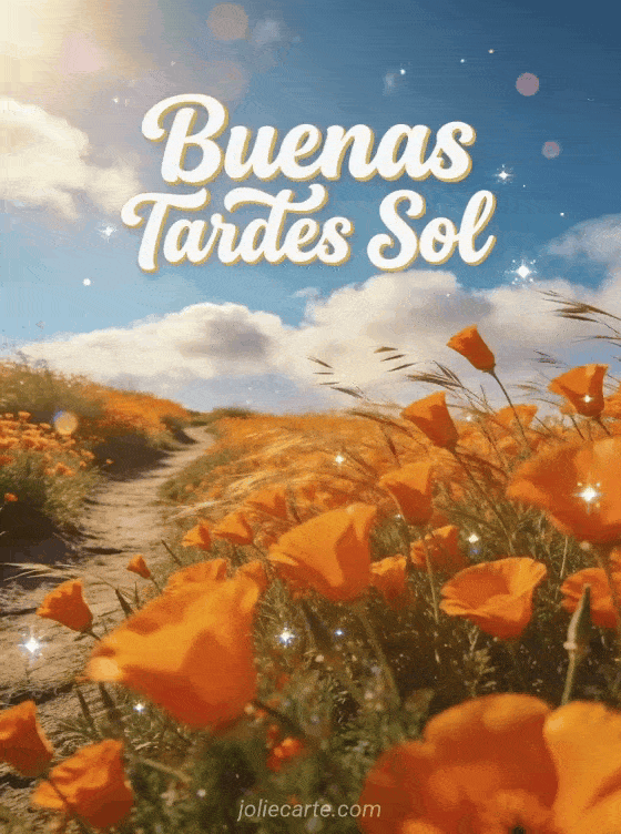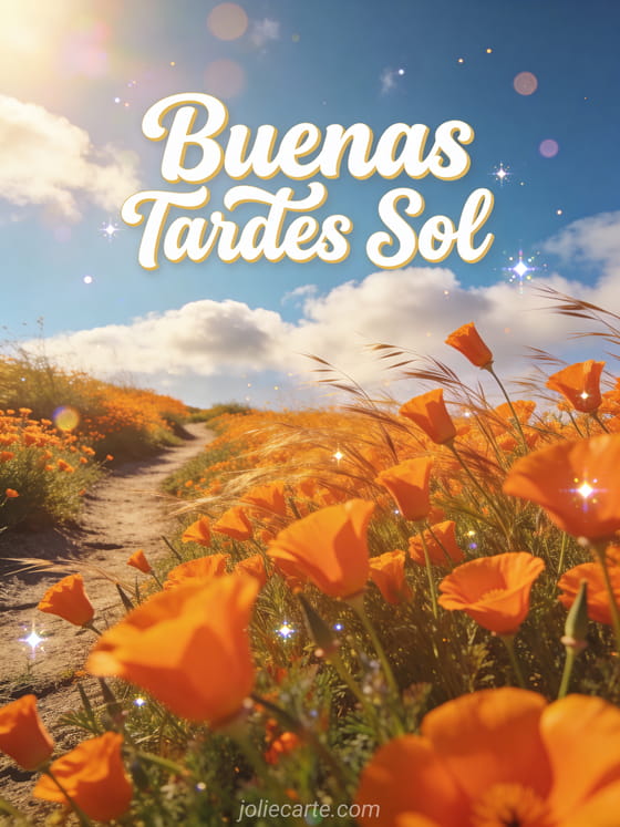 Comparte calidez con esta tarjeta de buenas tardes sol con un vibrante campo de amapolas silvestres naranjas en una tarde soleada. Descubre también una tarjeta de muy bellas imágenes buenas tardes o de imagen buenas tardes humor.