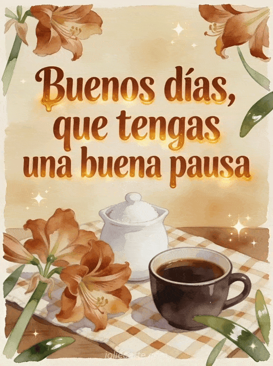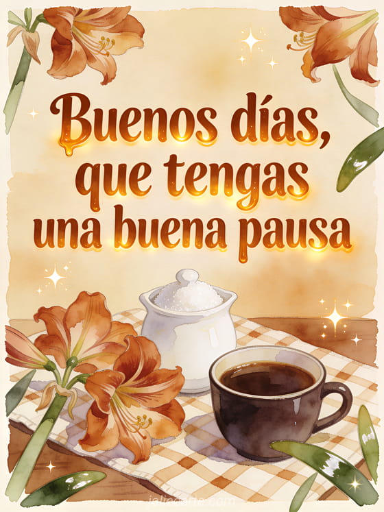 Desea una buena pausa con un azucarero blanco, una taza oscura de café, flores intensas de amarilis y un mantel a cuadros en luz cálida de acuarela. También pueden enviar buenos días mi corazón café, buenos días café café o gifs de buenos días con café.
