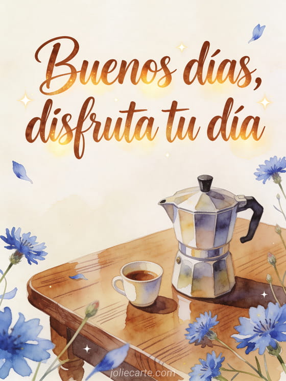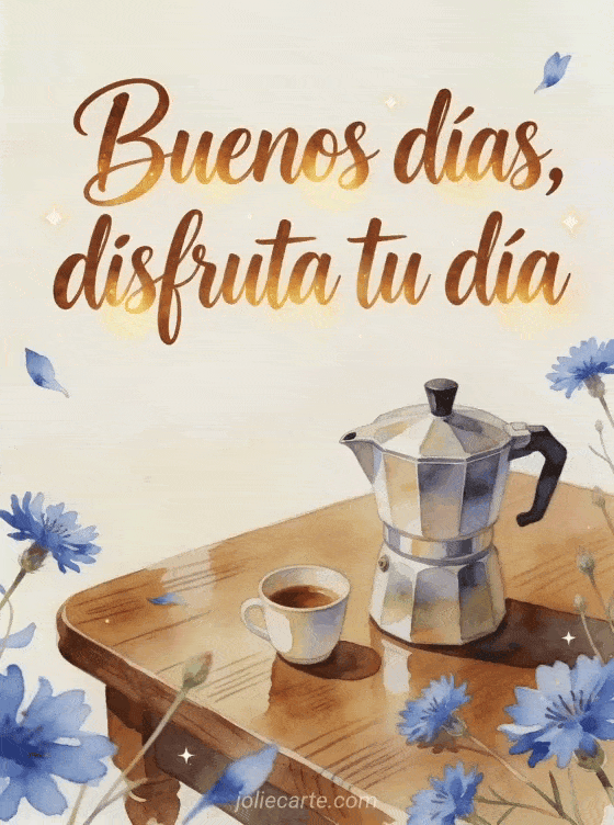 Empieza el día con letras cálidas en acuarela, una cafetera, una tacita y acianos azules sobre una mesa de madera pulida. Descubre también una tarjeta de buenos días café besos gif, una tarjeta de buenos días café corazón gif o una tarjeta de buenos días café mensaje.