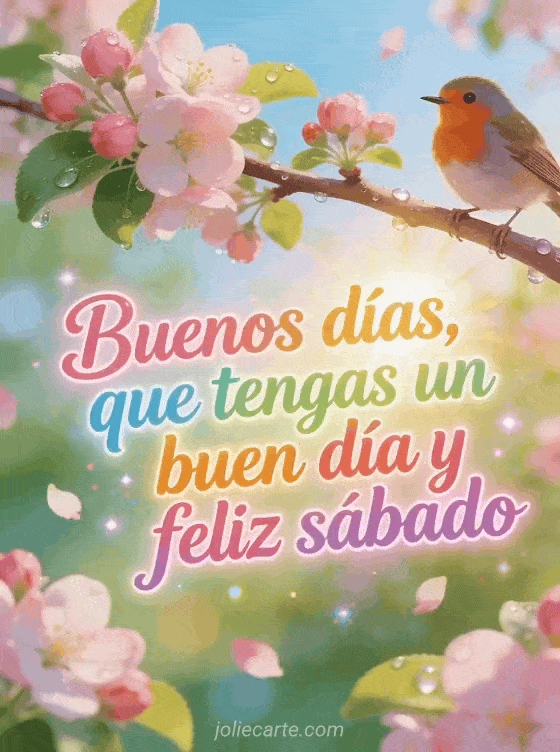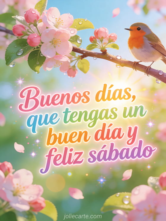 Comparte un saludo alegre de buenos días, buen día y feliz sábado con un petirrojo feliz en una rama de manzano en flor, rocío de primavera y flores rosadas. Descubre también una feliz sábado besos imagen, feliz sábado imagen gratis o una tarjeta virtual gratis feliz sábado.