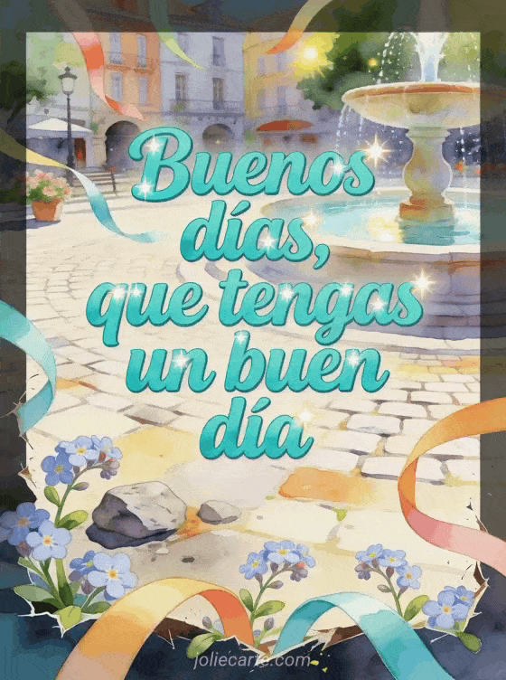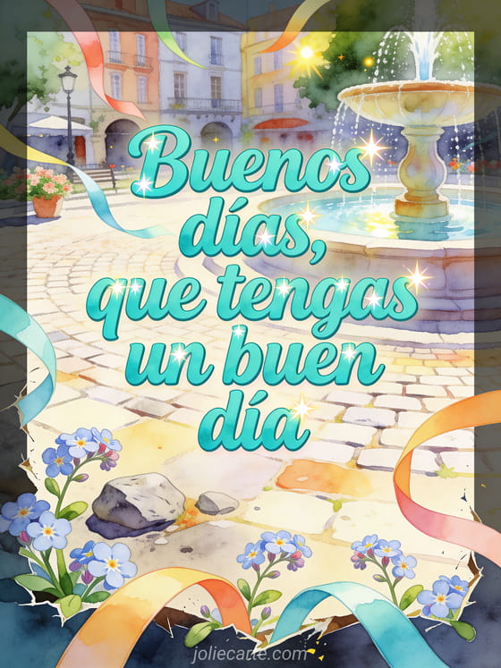 Comparte buenos días, que tengas un buen día con una fuente de plaza en acuarela, cintas al viento, flores de aubrieta y adoquines iluminados por el sol. También pueden enviar un buen día también gif, un buen día hada gif o un buen día besos gif animado.