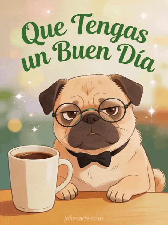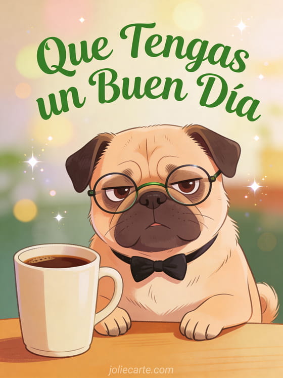 Buenos días buen día humor una divertida tarjeta de buen día con un pug gruñón pero adorable con mini gafas