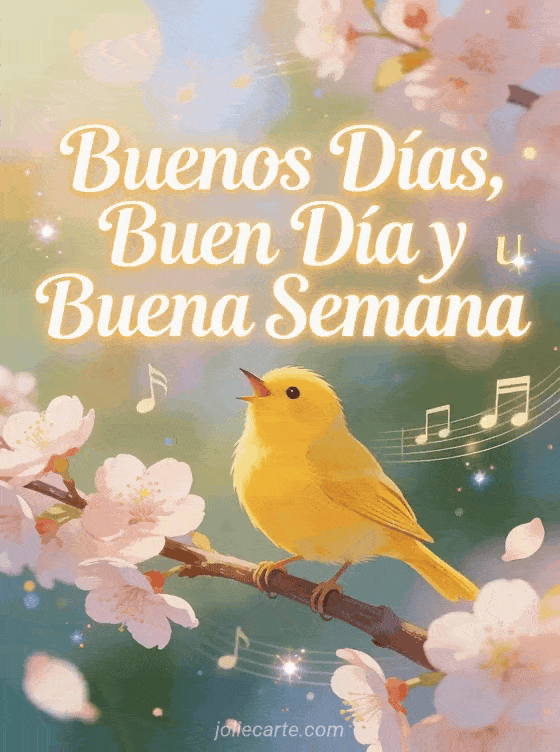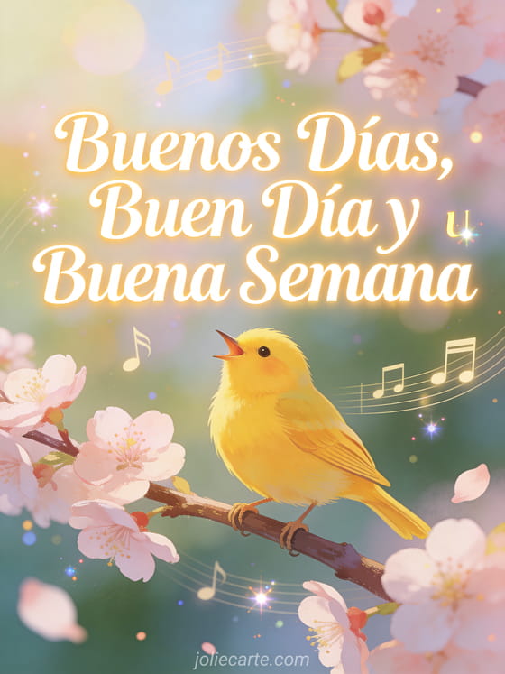 Desea buenos días y una buena semana con esta encantadora tarjeta que muestra un canario amarillo cantando sobre una rama de flores de cerezo con notas musicales flotando alrededor. Descubre también una buenos días y buena semana o una buena semana humor.