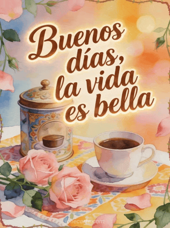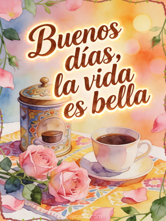 Comparte un recordatorio luminoso de la mañana: la vida es bella, con una lata de café decorativa, una taza y rosas rosadas sobre una tela estampada alegre. También pueden enviar gifs de buenos días con café, buenos días café cita o buenos días café ternura.