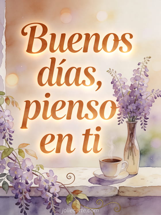 Comparte un pensamiento amable para alguien con esta tarjeta en acuarela, con un jarrón fino de glicina, hojas curvadas y una taza de café humeante sobre piedra clara. Descubre también buenos días café imagen, imagen de buenos días con café o buenos días con café gif animado.