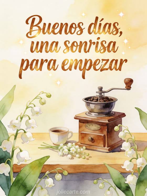 Empiecen el día con una sonrisa gracias a un molino de café vintage, una taza pequeña y ramitas de lirio de los valles sobre una encimera de madera luminosa. También pueden enviar una buenos días café flores imagen, una buenos días café imagen o una imagen de buenos días con café.