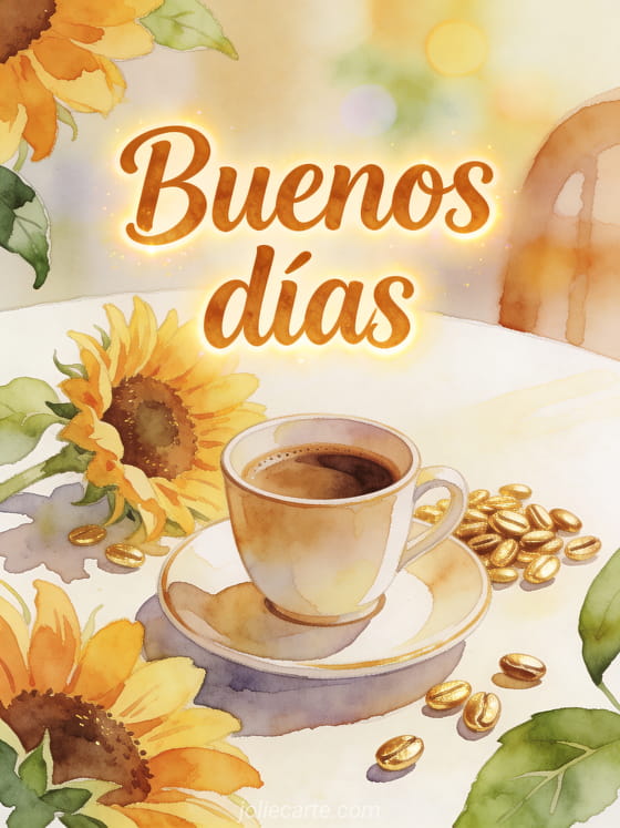 Comparte buenos días con letras caramelo, una taza de espresso sobre un plato, girasoles y granos de café dorados en una mesa de desayuno luminosa. Descubre también imagen bonita buenos días café, buenos días buen café de la mañana o bonita imagen de buenos días con café.