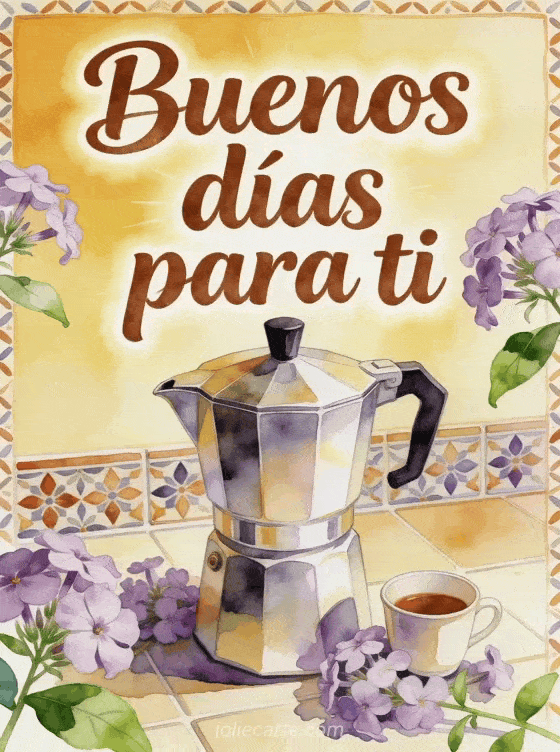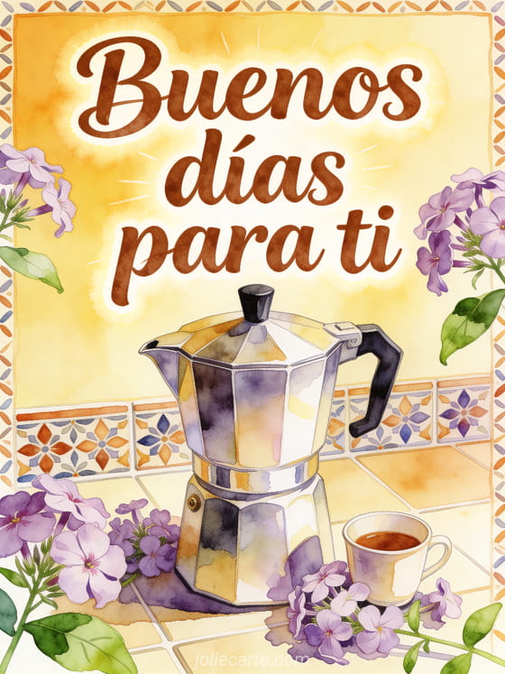 Comparte una tarjeta cálida de buenos días con café, una cafetera moka pulida, una tacita, flores phlox y azulejos de cocina estampados con luz dorada. También puedes enviar una imagen de buenos días con café, un buenos días con café gif animado o un buenos días buen café gif.