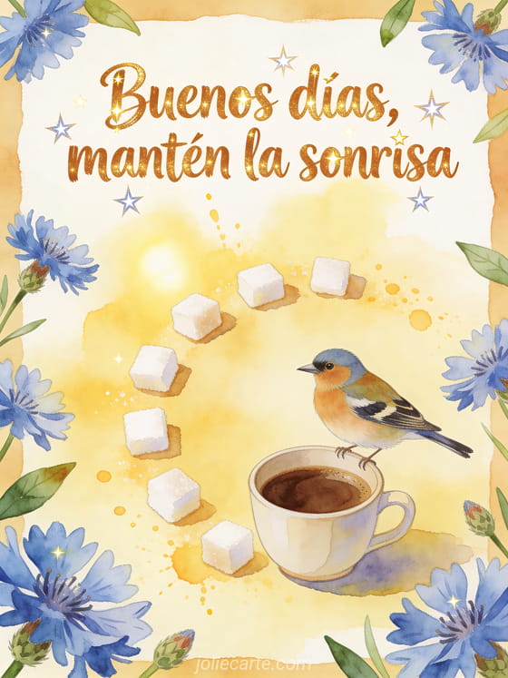 Envía un saludo alegre de buenos días con un pinzón junto a una taza de café, cubos de azúcar y pétalos de aciano. Descubran también una café con leche buenos días, una buenos días café mensaje o una buenos días café gif.