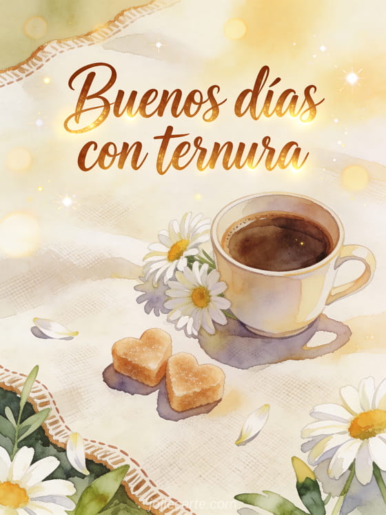 Comparte un deseo suave de mañana con letras castañas en acuarela, una taza de café, margaritas, terrones de azúcar en forma de corazón, lino claro y bokeh brillante. Descubre también una tarjeta de gif brillante de buenos días con café, una tarjeta de café buenos días mi querida o una tarjeta de café de la mañana buenos días.
