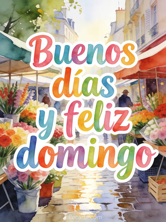 Comparte un saludo luminoso de domingo por la mañana con un mercado de flores animado, ramos coloridos y luz fresca de ciudad. Descubran también feliz domingo mi amor besos, feliz domingo animado o gifs animados mariquita feliz domingo.