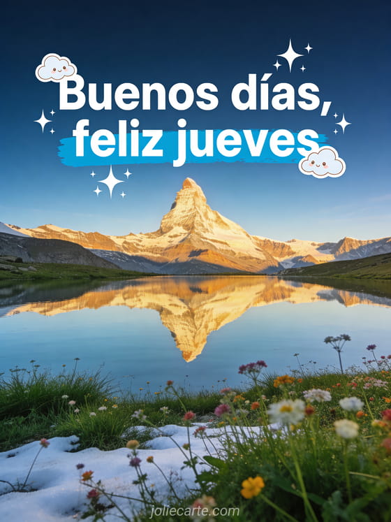 Compartan una tarjeta realista de buenos días feliz jueves con letras blancas nítidas, nubes tiernas, estrellas brillantes, el majestuoso Cervino reflejado en un lago alpino en calma y praderas con flores bajo la luz dorada de la mañana. Vean también feliz jueves besos imagen, feliz jueves que tengas un buen día o esta feliz jueves caluroso imagen.