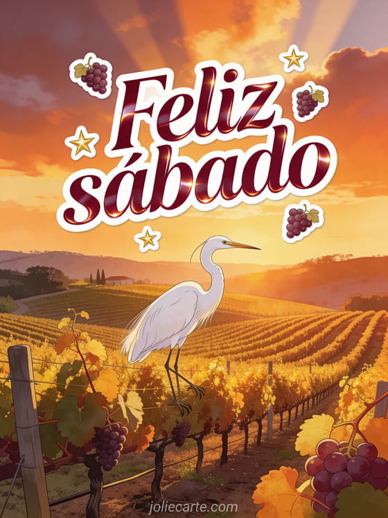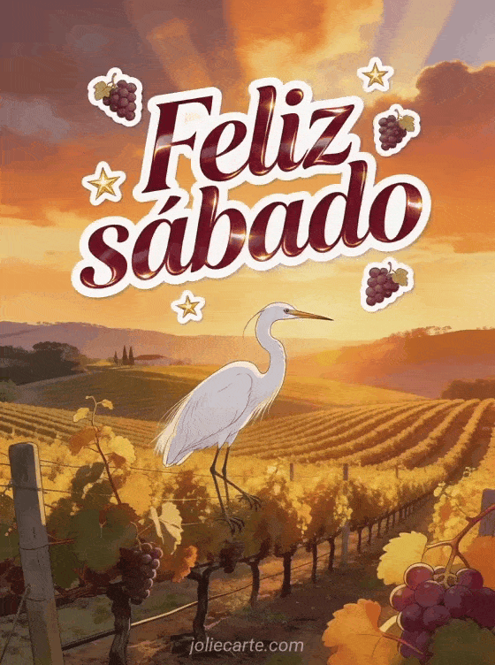 Envía un feliz sábado cálido con un viñedo de Napa Valley, hileras doradas de vides, stickers de uvas y una majestuosa garceta blanca posándose bajo luz anaranjada de atardecer. Descubran también feliz sábado amigos gifs, amistad feliz sábado buen fin de semana o buenos días feliz sábado besos.