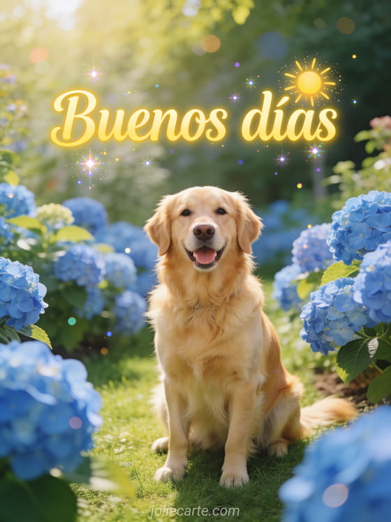 Comparte un saludo luminoso de buenos días con un golden retriever feliz en un jardín soleado de hortensias azules. Descubre también una linda imagen de feliz viernes, un feliz viernes sol gif o una imagen de feliz viernes con flores.