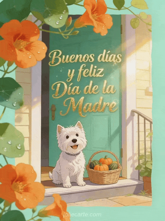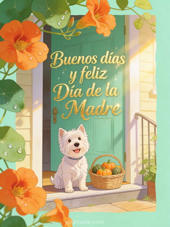 Empieza su día especial con un cálido saludo de buenos días feliz día de la madre. Esta alegre tarjeta ilustrada muestra un perrito westie en la entrada con flores capuchinas. Descubre también una tarjeta día de la madre gratis o una tarjetas del día de la madre gratis.