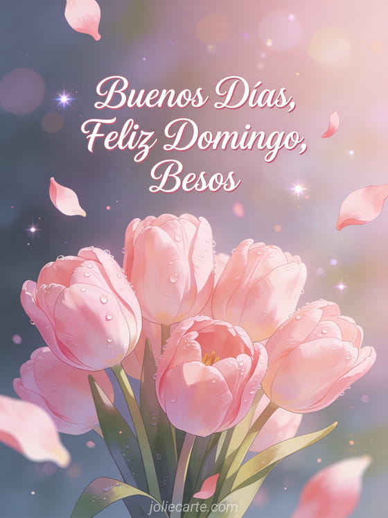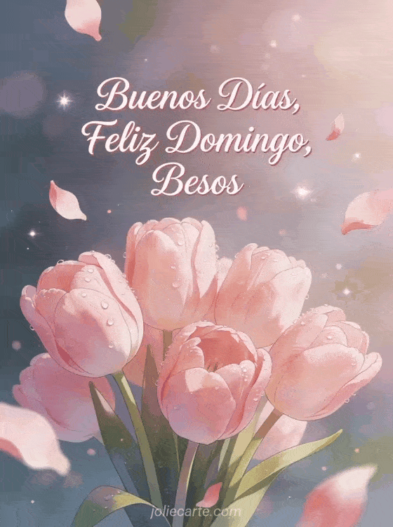 Empieza el domingo de alguien con ternura y afecto con esta romántica tarjeta con un hermoso ramo de tulipanes rosas con rocío matinal. Descubre también una tarjeta feliz domingo gif gracioso, una tarjeta imágenes feliz domingo besos o una tarjeta muy feliz domingo.