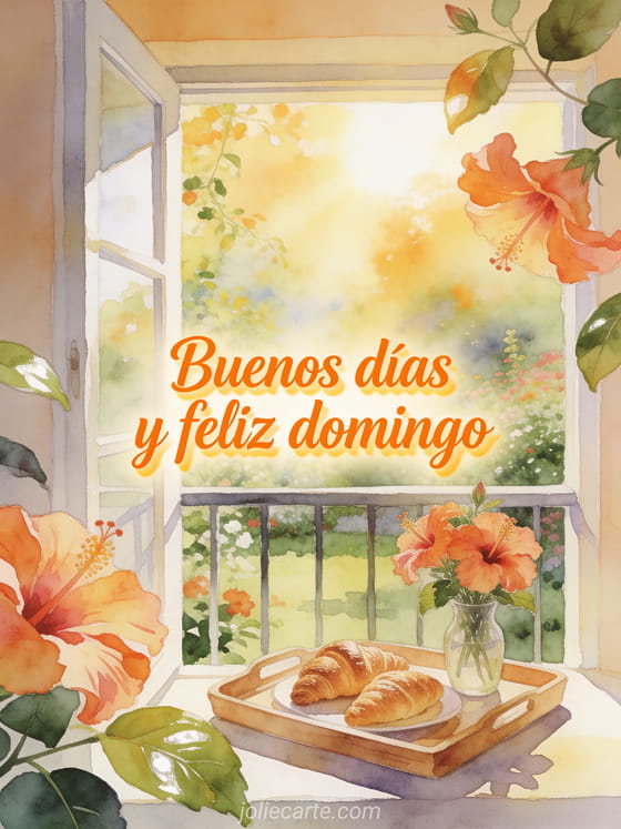 Envía un mensaje luminoso de domingo por la mañana con croissants, flores de hibisco y vista a un jardín desde un balcón en acuarela. Descubre también feliz domingo imágenes con flores, un mensaje para decir feliz domingo o una feliz domingo imagen gratis.