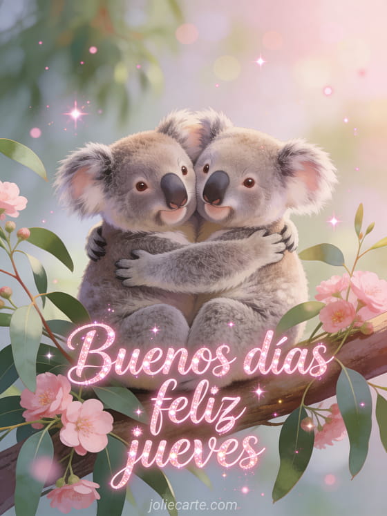 Alegra el jueves de alguien con esta tierna tarjeta con dos adorables koalas abrazados en ramas de eucalipto. Descubre también buenos días jueves lluvioso o feliz jueves grandes besotes.