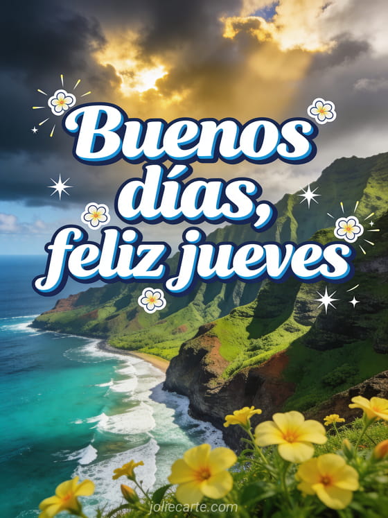 Envía buenos días feliz jueves deporte imagen con letras deportivas blancas, contornos azul marino, stickers de prímulas y estrellas fugaces sobre la costa de Na Pali en Hawái. Comparte un deseo lleno de energía entre semana y descubre también tarjetas para desear un feliz jueves, buenos días feliz jueves o imagen animada de feliz jueves.