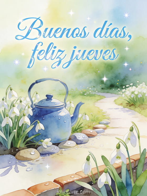 Comparte una tarjeta fresca de buenos días y feliz jueves con campanillas de invierno, una tetera azul esmaltada, piedras con rocío y un camino de jardín luminoso. Descubre también feliz jueves gifs, buenos días y feliz jueves imagen o feliz jueves café gif.