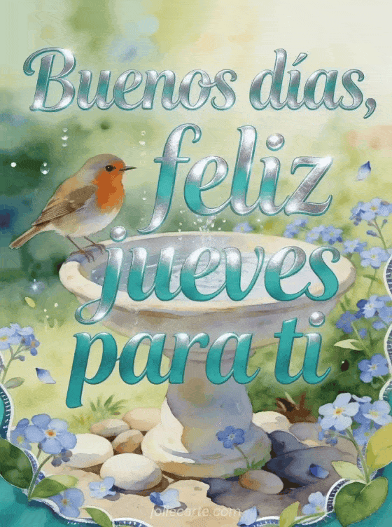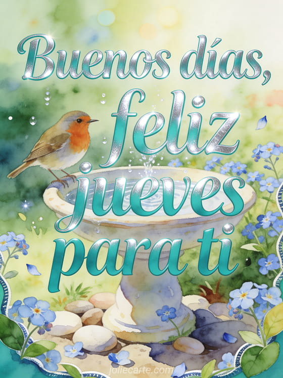 Comparte una tarjeta luminosa de feliz jueves con un petirrojo junto a un bebedero de cerámica para aves, flores nomeolvides, guijarros redondeados y agua brillante de jardín. También puedes enviar buenos días y buen día de jueves, llueve feliz jueves bajo la lluvia o agradable jueves besos.