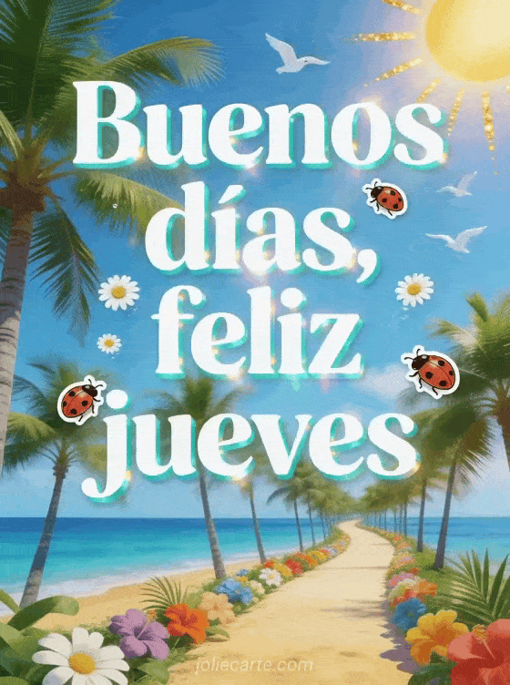 Envía un saludo luminoso de buenos días y feliz jueves con letras blancas, reflejos turquesa, mariquitas, margaritas, un camino bordeado de palmeras junto al mar azul, arena dorada y flores tropicales bajo un sol radiante. También pueden ver esta tarjeta feliz jueves gratis, esta desear un feliz jueves en imagen o este buen día jueves.