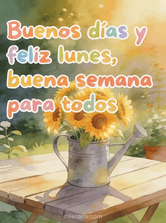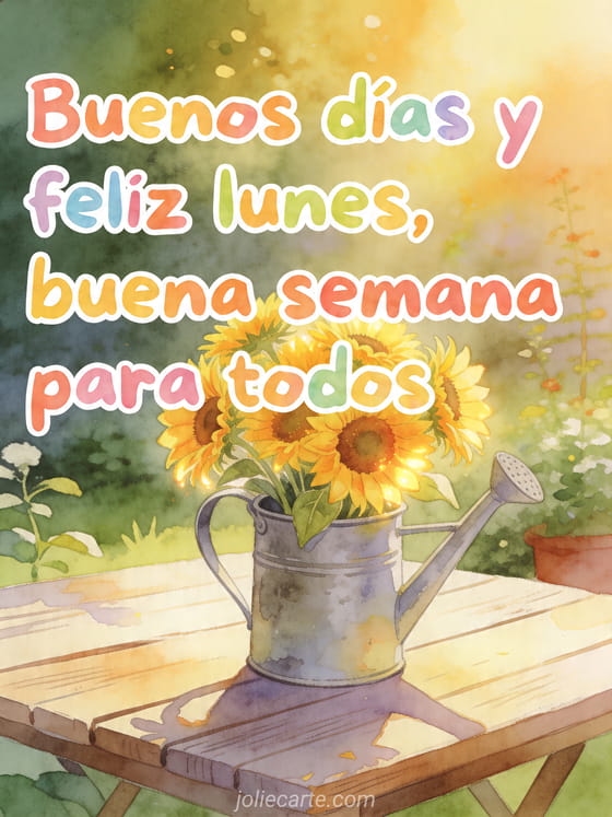Comparta un alegre saludo de lunes con esta luminosa tarjeta que muestra un ramo de girasoles en una regadera sobre una mesa de jardín. También puede descubrir imágenes café feliz lunes, feliz lunes foto o imagen para decir feliz lunes.