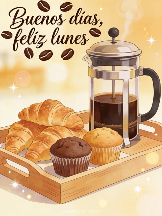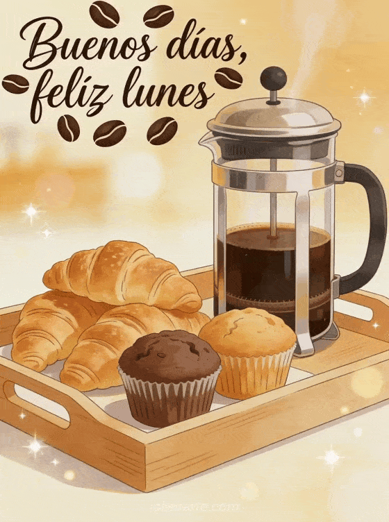 Envíen un cálido saludo de buenos días feliz lunes con letras estilo bistró, café de prensa francesa y pasteles frescos en una bandeja de desayuno. Descubran también feliz lunes buena semana gif, feliz lunes café imagen o feliz lunes buenos días buena semana.