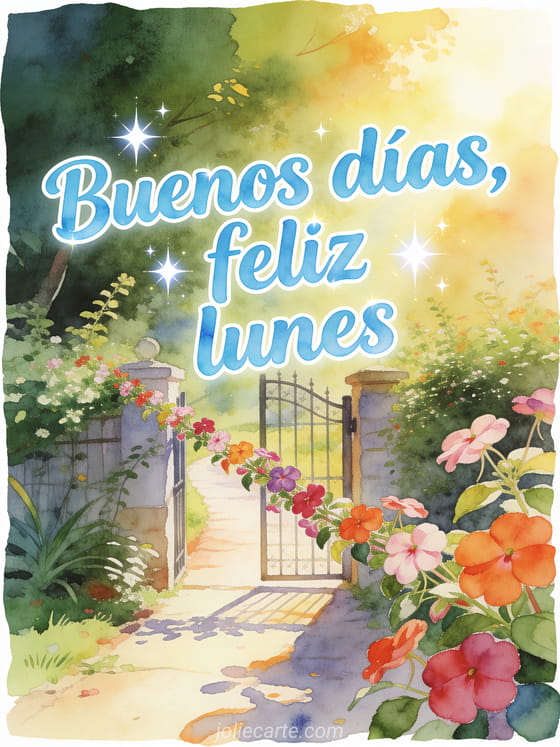 Recibe la semana con un portal de jardín luminoso en acuarela que se abre a un camino soleado, rodeado de flores impatiens y color radiante. También pueden compartir bellas imágenes para desear un feliz lunes, feliz lunes flores gif o feliz lunes imagen brillante.