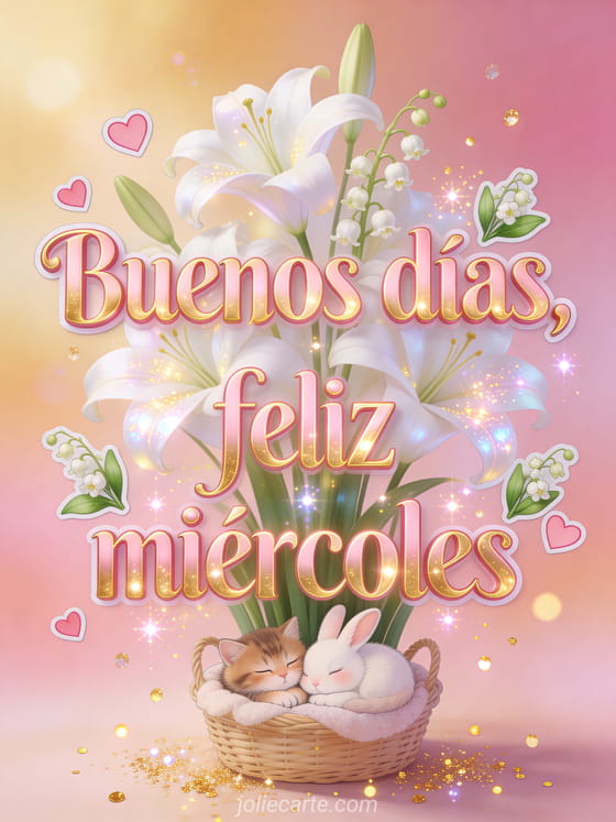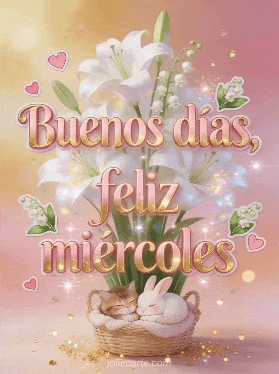 Compartan una tarjeta suave de buenos días feliz miércoles con letras rosa dorado, corazones rosados, muguet, lirios blancos majestuosos y un gatito acurrucado con un conejo en una cesta acogedora. Exploren también feliz miércoles flores gifs, esta buenos días buenos días feliz miércoles imagen o estas feliz miércoles fotos.