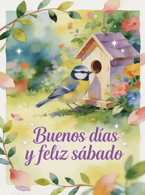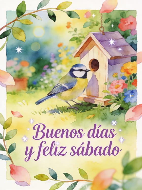 Comparte un mensaje luminoso de sábado por la mañana con un carbonero común junto a un pequeño nido para pájaros en un rincón colorido de jardín. También puedes enviar una feliz sábado mujer imagen, un feliz sábado café gif o una feliz sábado a todos imagen.