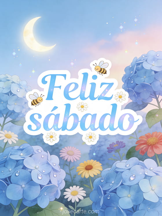 Envía un feliz sábado delicado con hortensias azules, zinnias coloridas, abejas alegres, rocío brillante y una luna creciente luminosa en un cielo crepuscular. Descubran también feliz sábado calentito, buenos días buen día feliz sábado o una feliz sábado besos imagen.