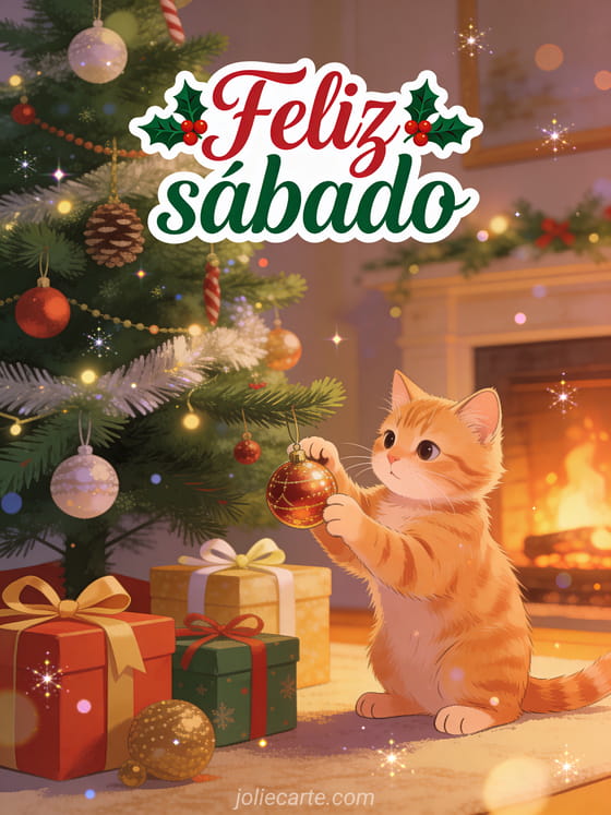 Comparte una tarjeta cálida de feliz sábado Navidad con letras rojas y verdes, un árbol decorado, un lindo gato naranja jugando con un adorno, regalos envueltos y el brillo de una chimenea. Descubre también feliz sábado imágenes divertidas o feliz sábado con gatos.