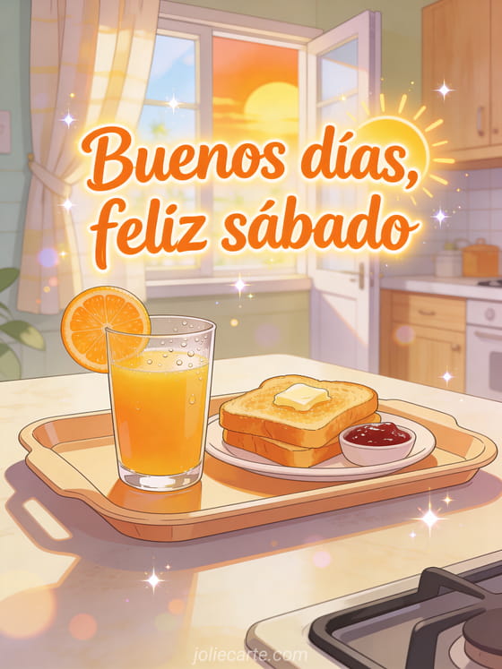 Comparte buenos días feliz sábado con una bandeja de desayuno con jugo de naranja fresco y tostadas en una cocina luminosa por la mañana. Empieza el fin de semana con salam aleikum feliz sábado, feliz sábado café gif o gifs feliz sábado.
