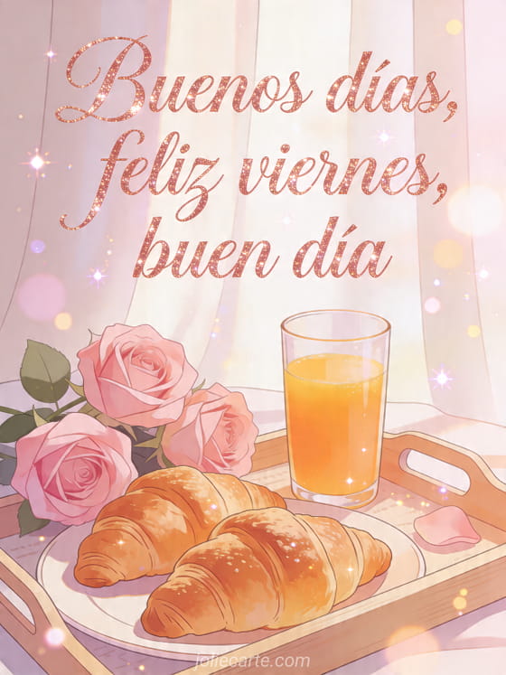Compartan un cálido buenos días y feliz viernes con esta tarjeta gratis y alegren la mañana con un desayuno elegante. También pueden descubrir feliz viernes gato, buenos días es viernes gif o viernes besitos gifs.