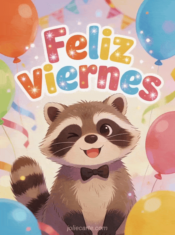 Comparte un saludo alegre de feliz viernes con un mapache adorable que lleva una pequeña pajarita, rodeado de globos de colores y serpentinas festivas. Descubre también paisaje feliz viernes, una tarjeta animada de feliz viernes o un feliz viernes a todos gif.