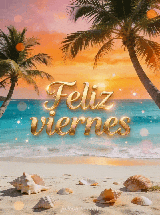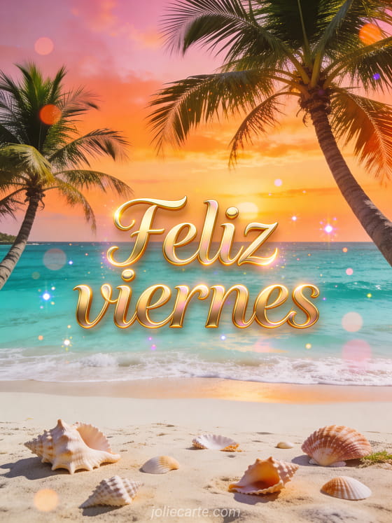 Comparte un saludo relajante de feliz viernes con una playa tropical, agua turquesa, arena blanca, palmeras y conchas bajo una cálida luz de atardecer. Descubre también imagen divertida imagen divertida feliz viernes humor, un feliz viernes corazón o buenos días hermoso día de viernes.